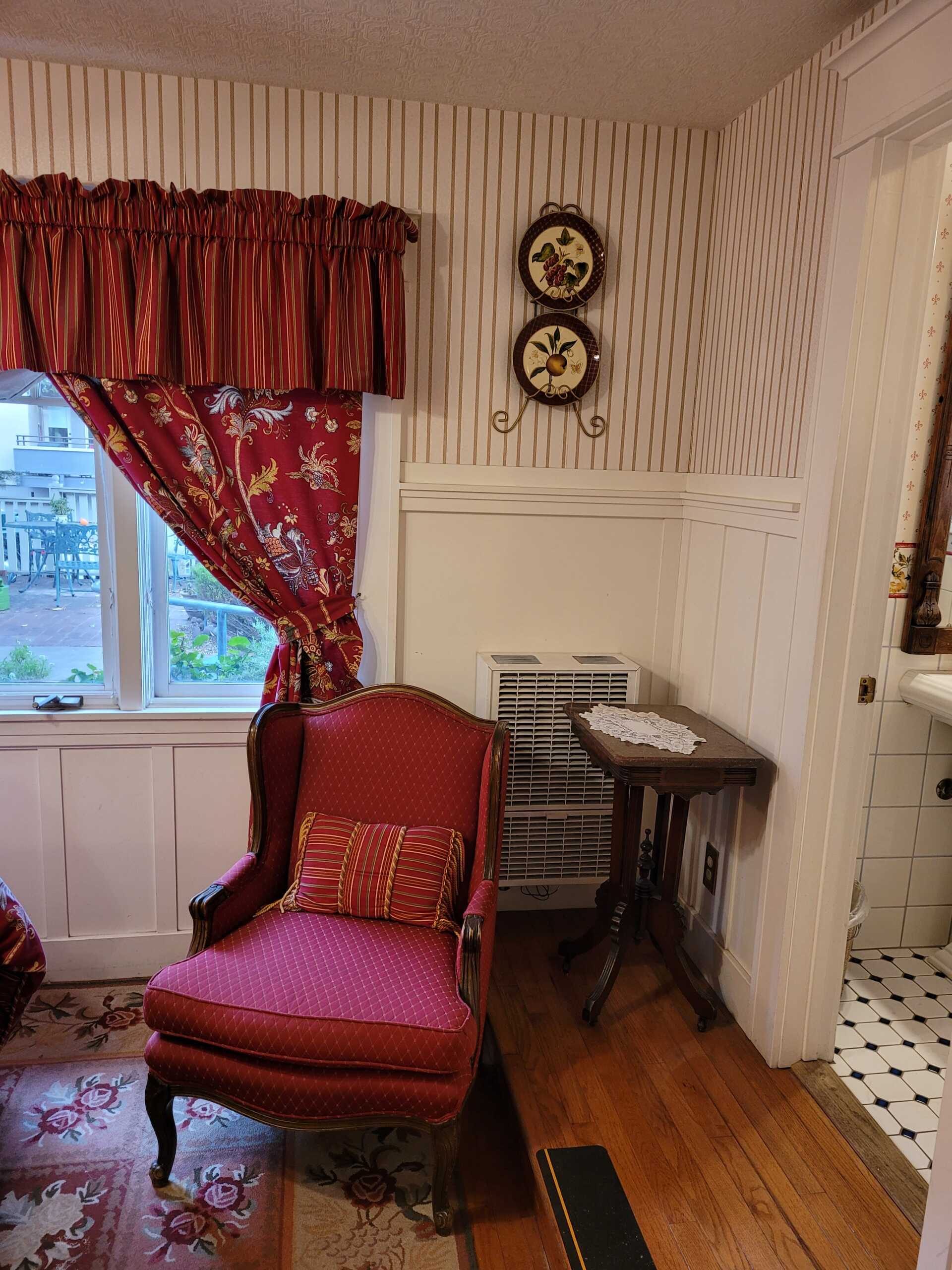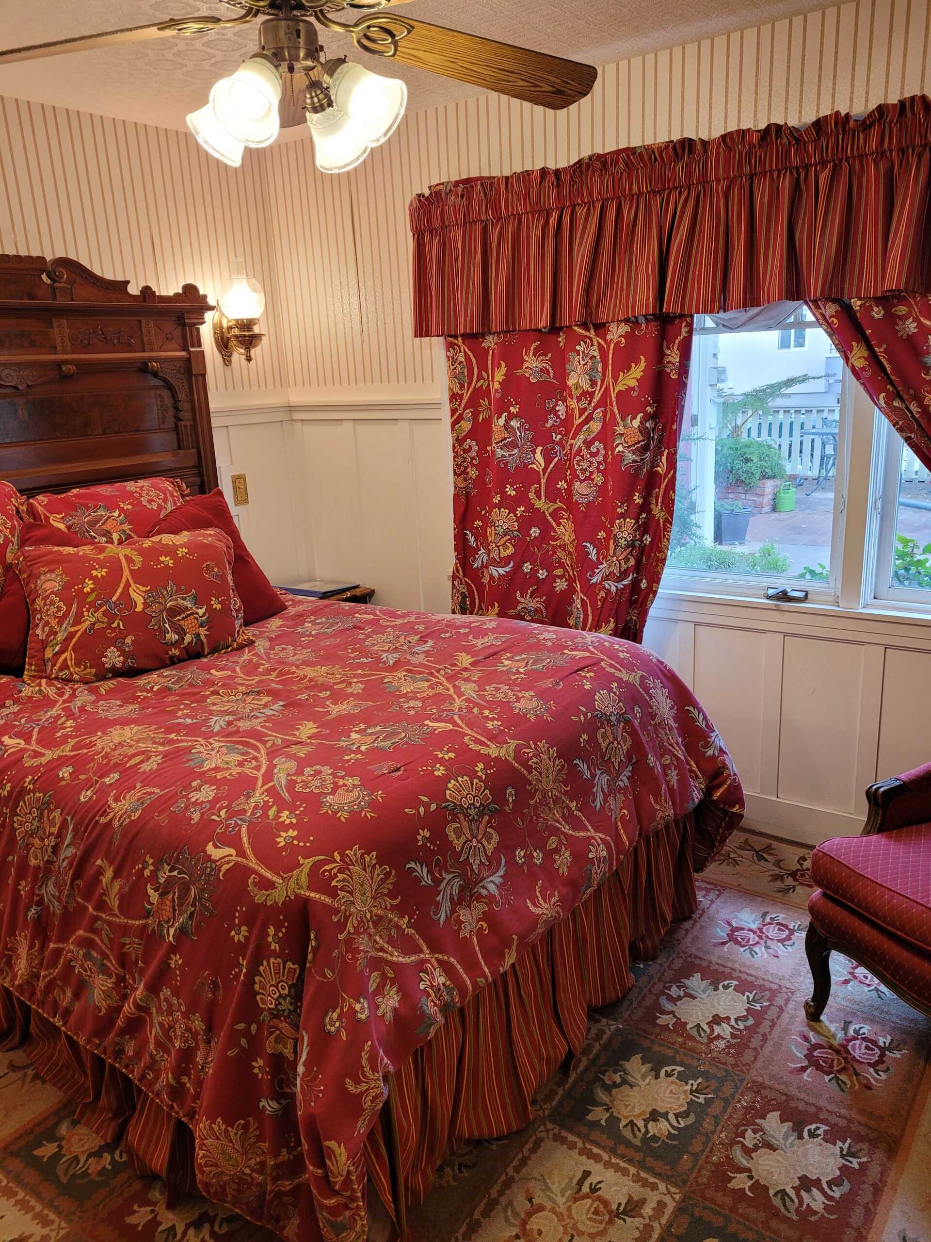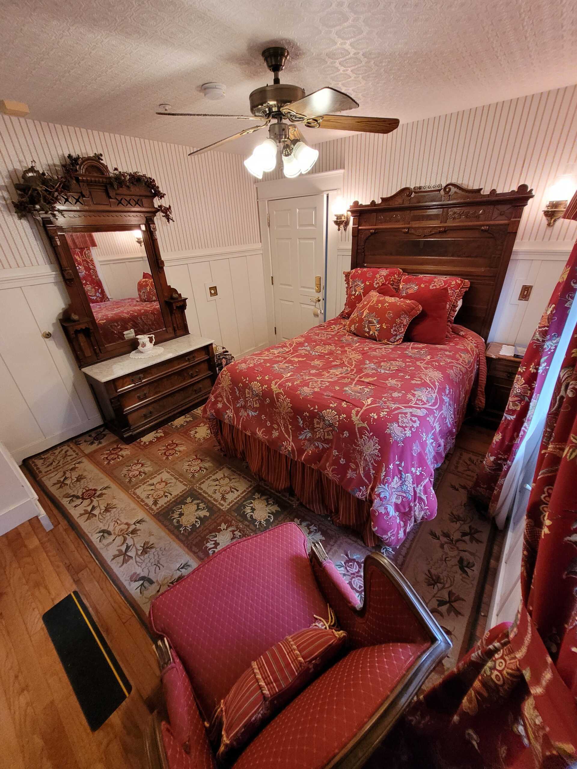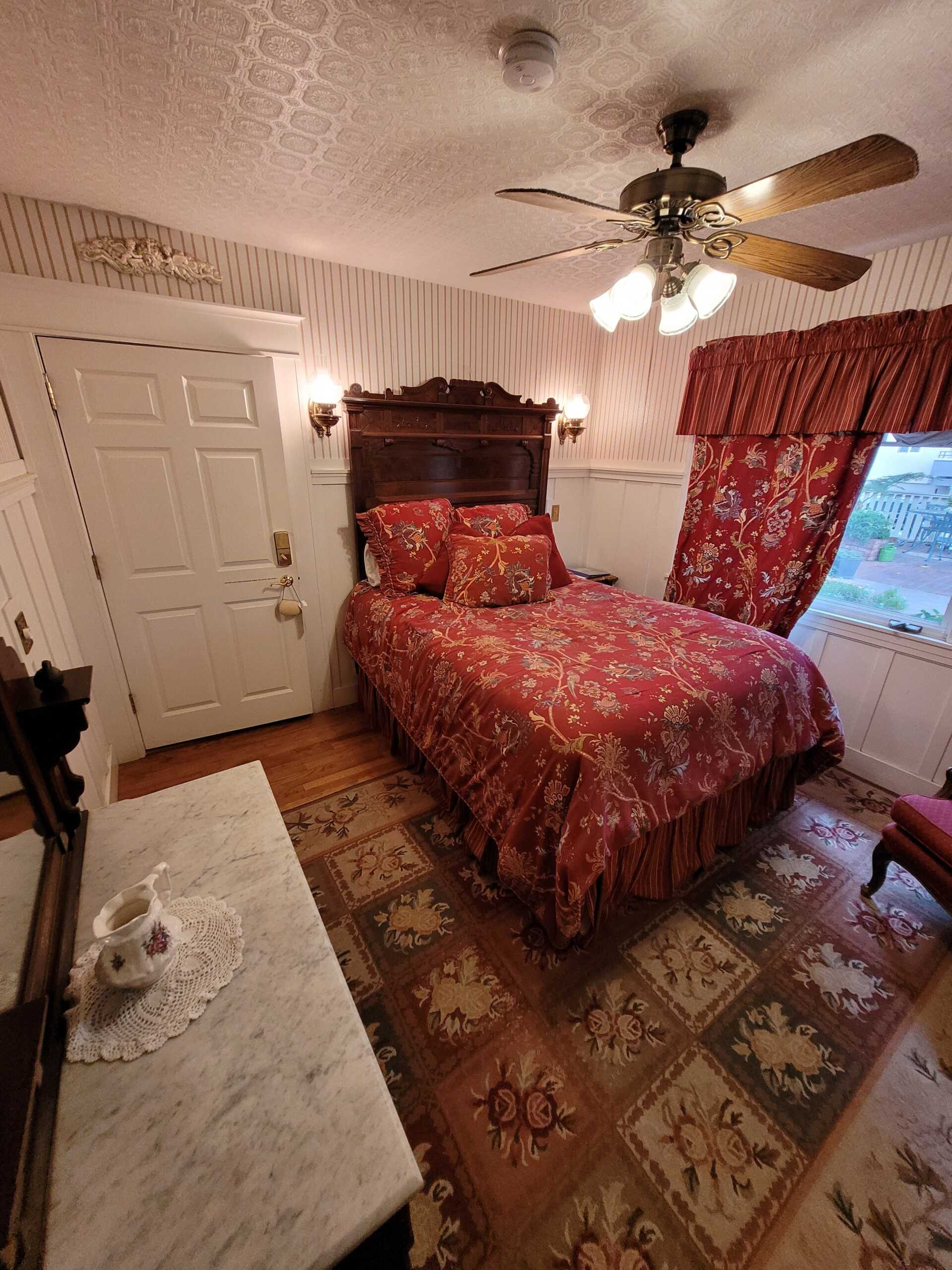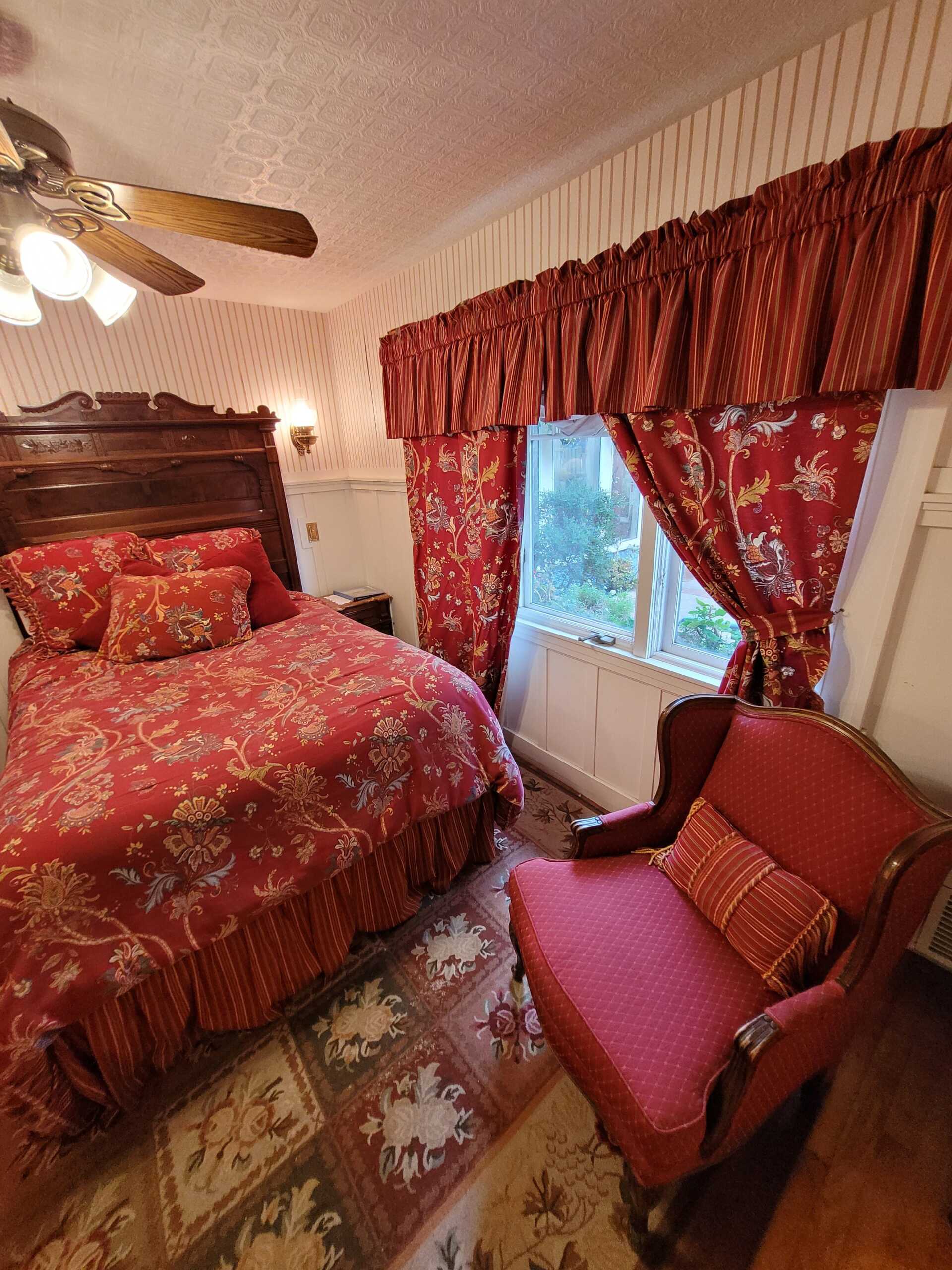 The romantic Victorian era is maintained in the Newport Room, decorated with Eastlake furnishings and red & florals. A garden view and sitting area add to the ambiance. Enjoy the tub with showerhead in this room's very own private bathroom.