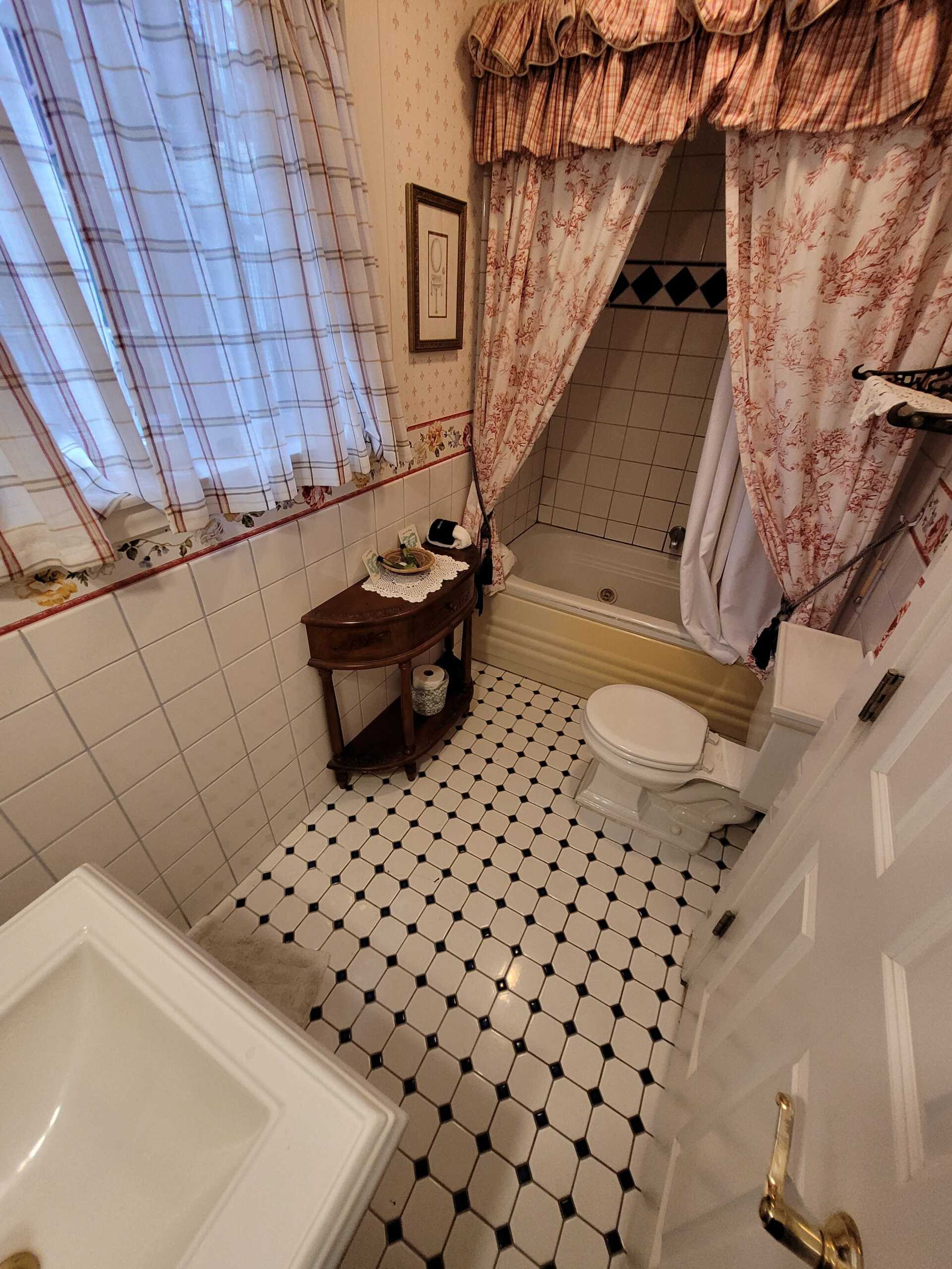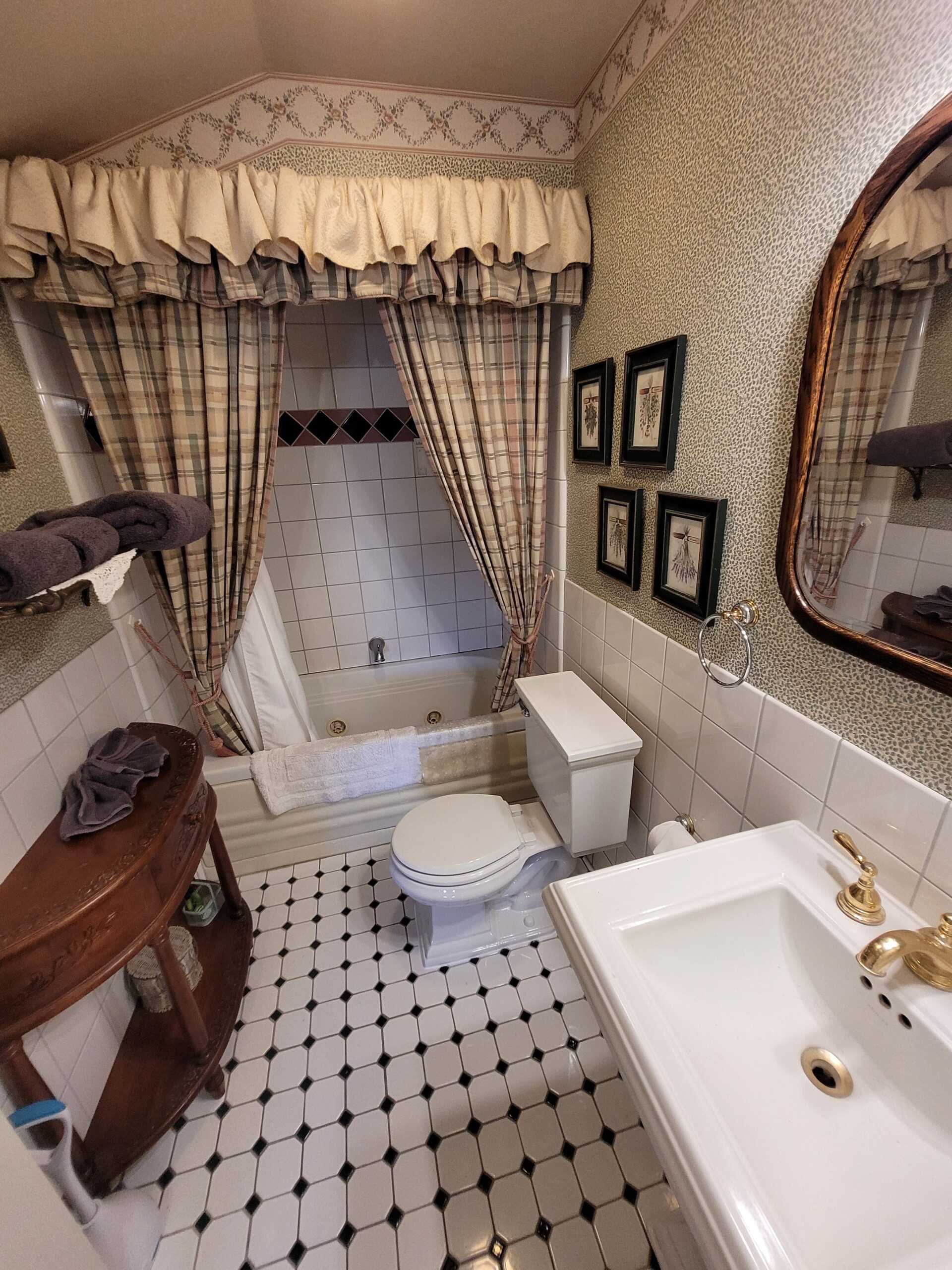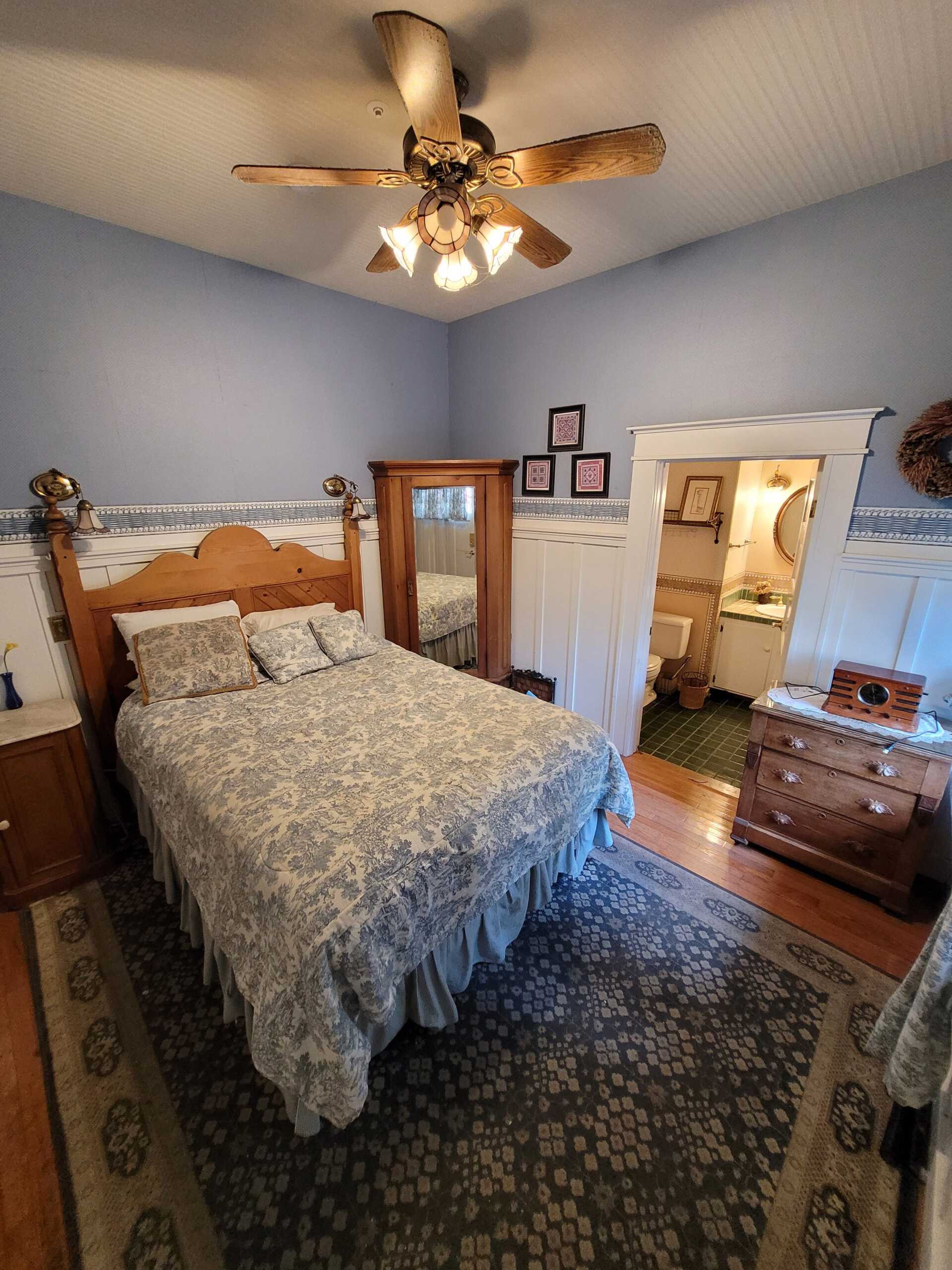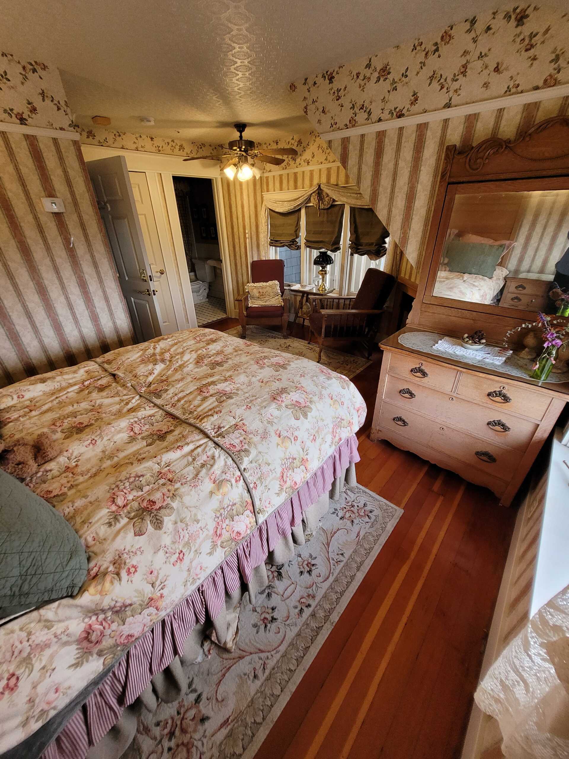This quaint country casual room is decorated in butter yellow and chambray. A queen size antique oak bedroom set and sitting area add to the Nantucket's homey feel. The Nantucket has a private bathroom with bathtub and showerhead.