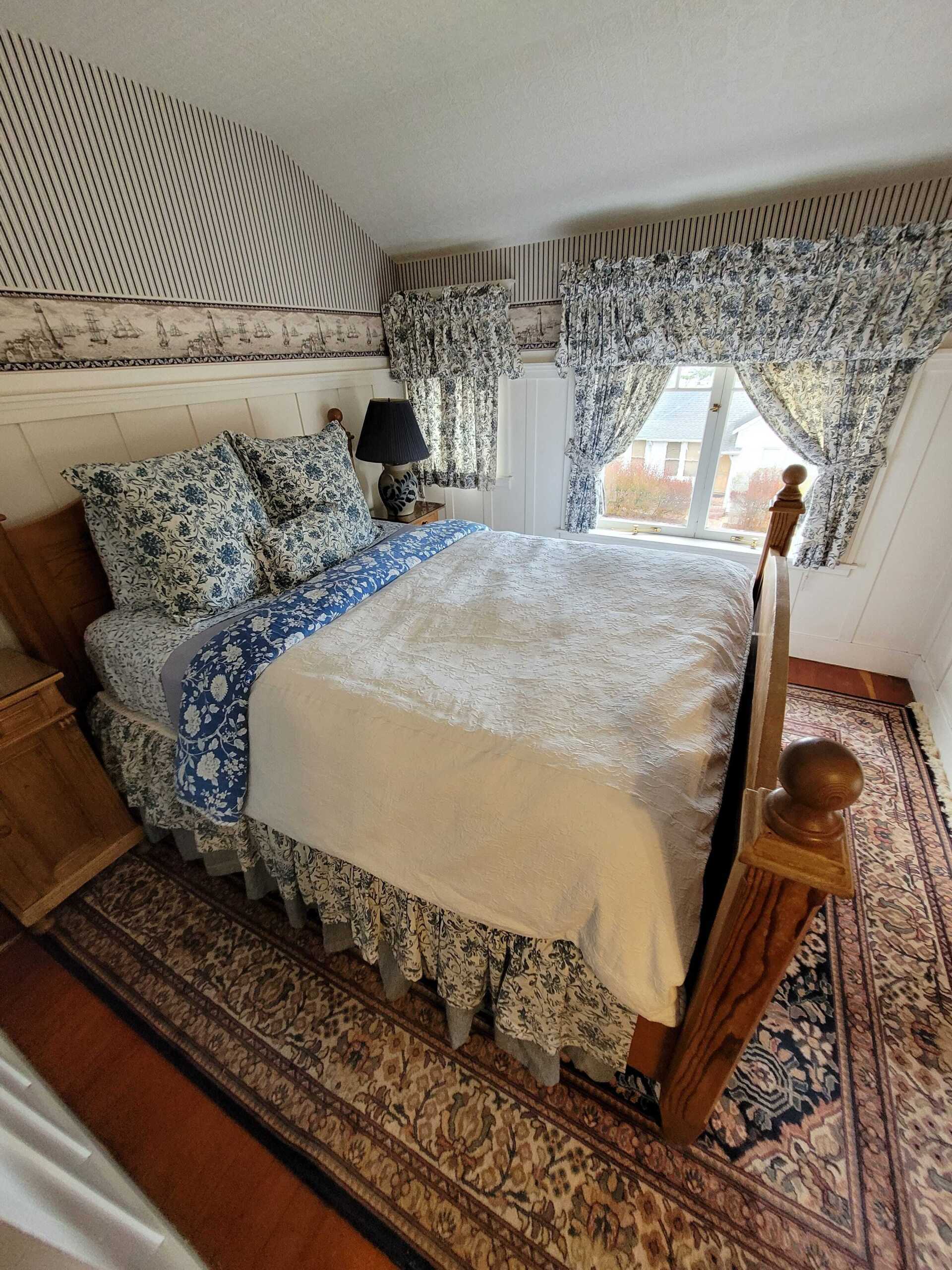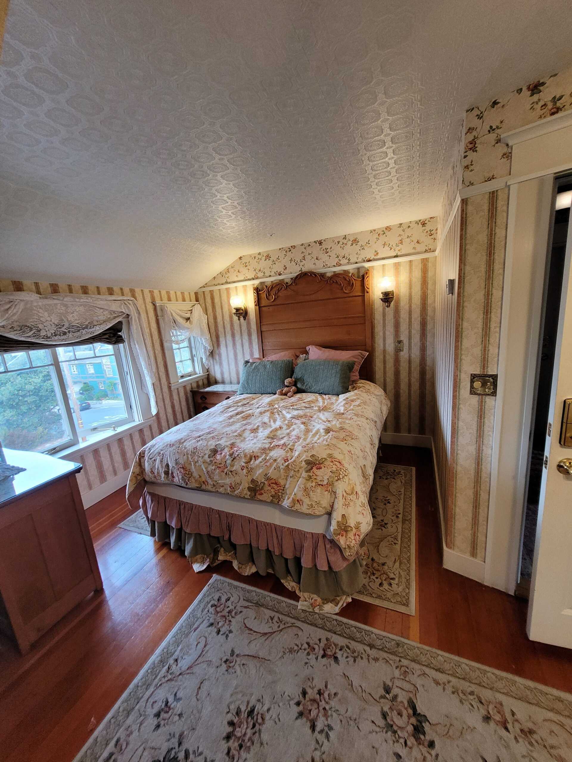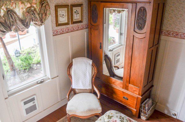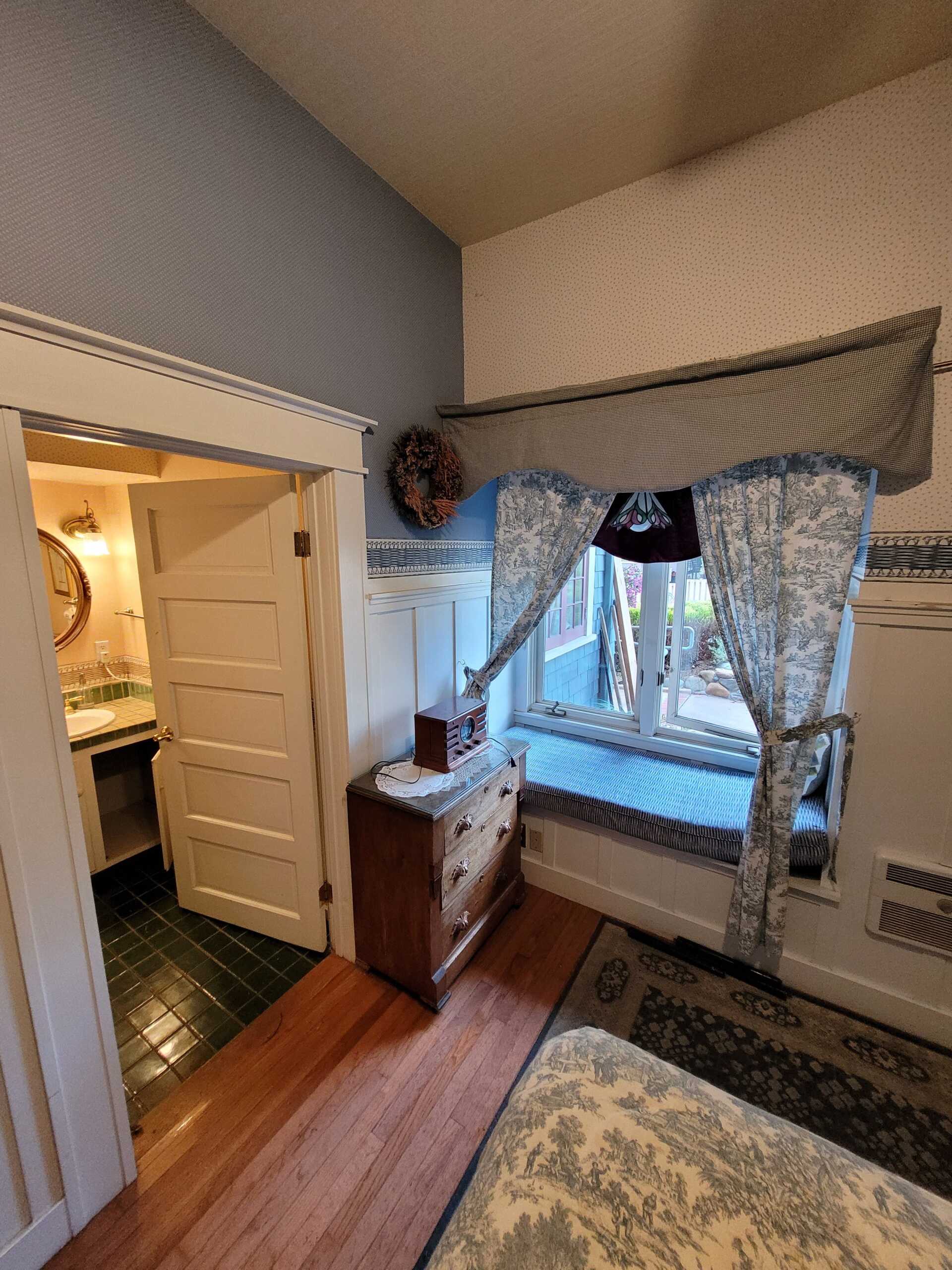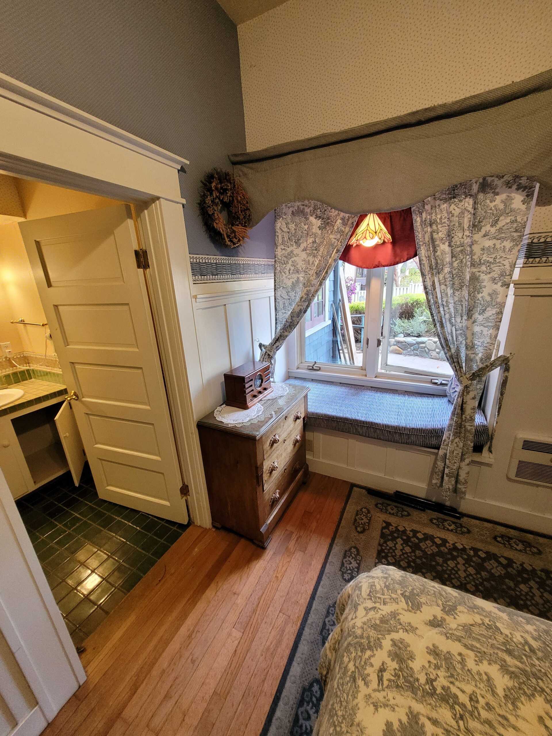 A bit of the East coast in Pacific Grove, this room is decorated in old fashioned rose and blue florals, has a cast iron stove, and a view of Central Ave. The turn of the century queen bed and antique furnishings will conjure fond memories of days gone by. The Cape Cod has a private bathroom with bathtub and showerhead.