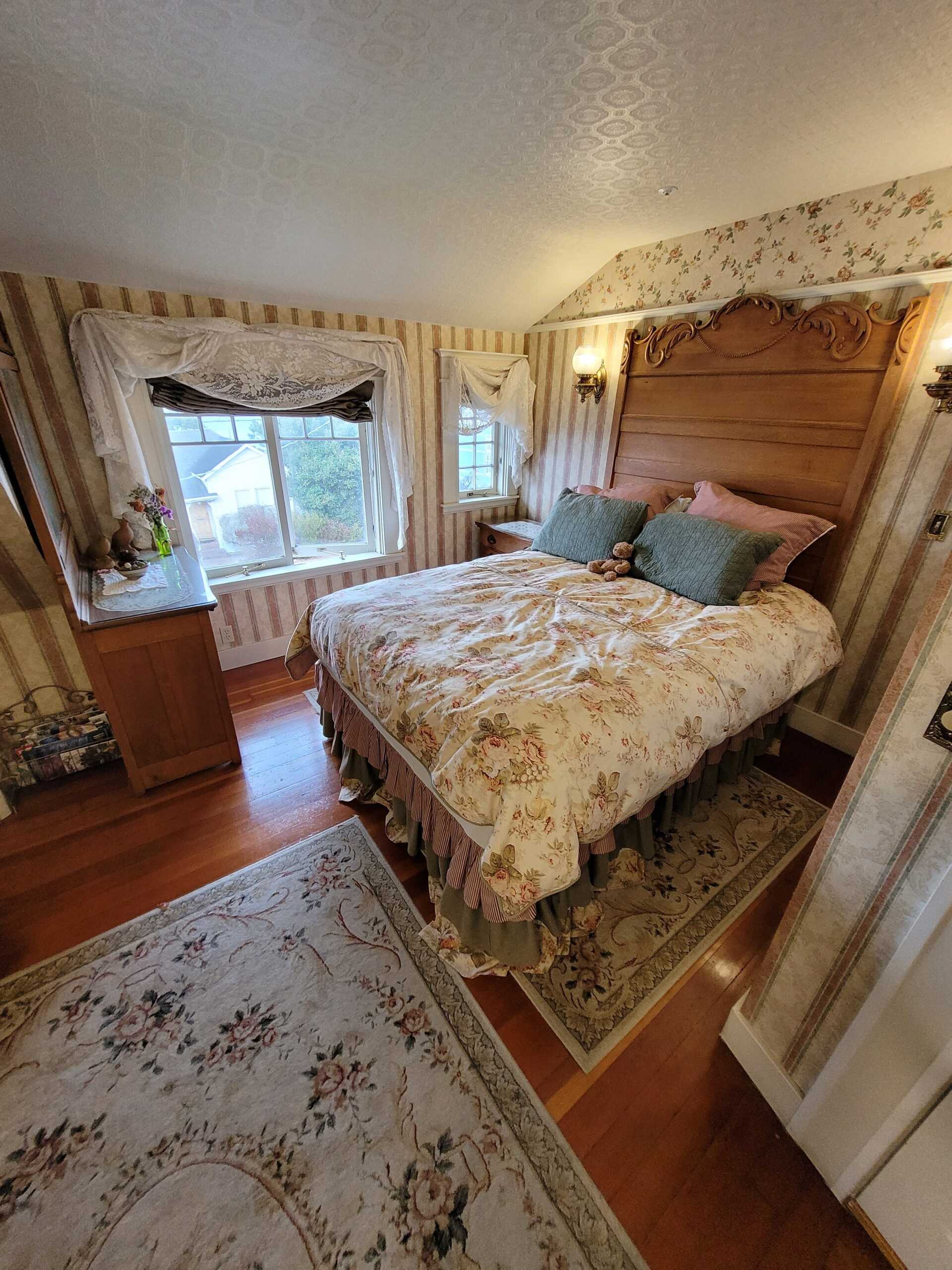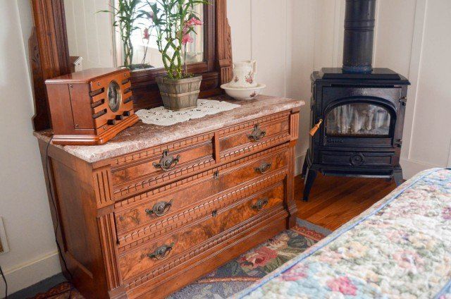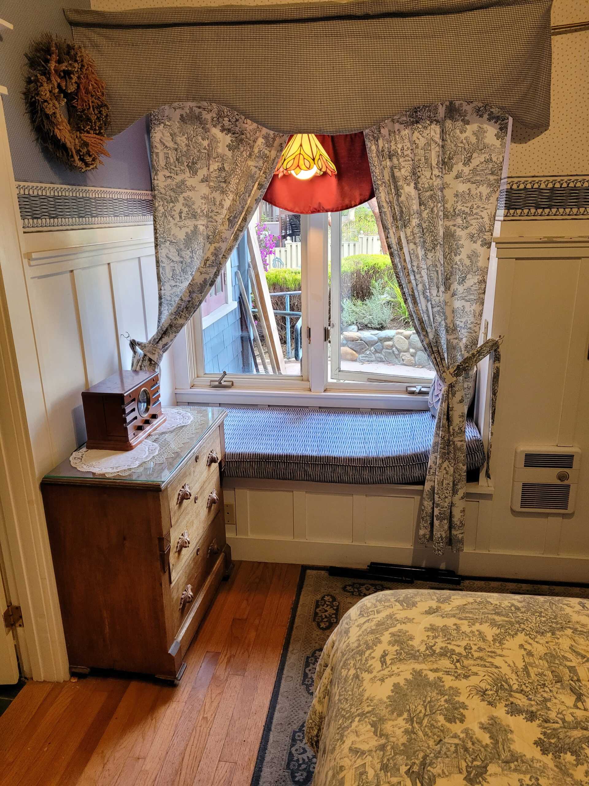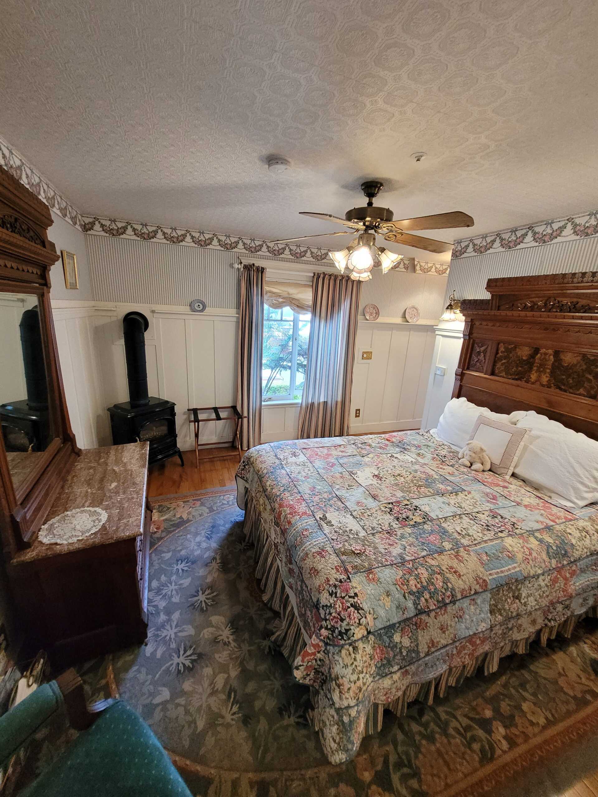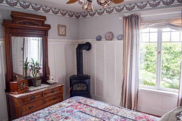 A bit of the East coast in Pacific Grove, this room is decorated in old fashioned rose and blue florals, has a cast iron stove, and a view of Central Ave. The turn of the century queen bed and antique furnishings will conjure fond memories of days gone by. The Cape Cod has a private bathroom with bathtub and showerhead.