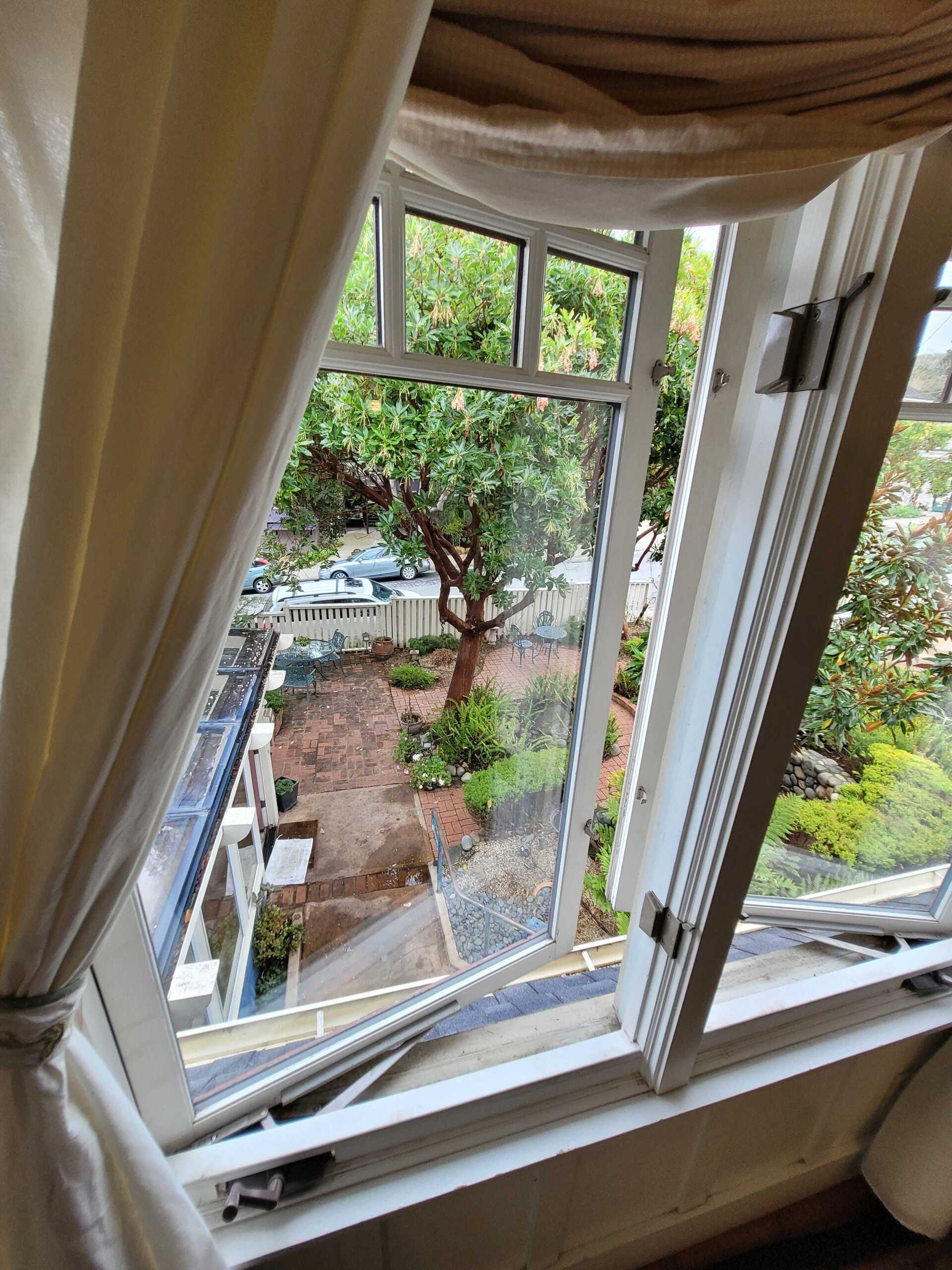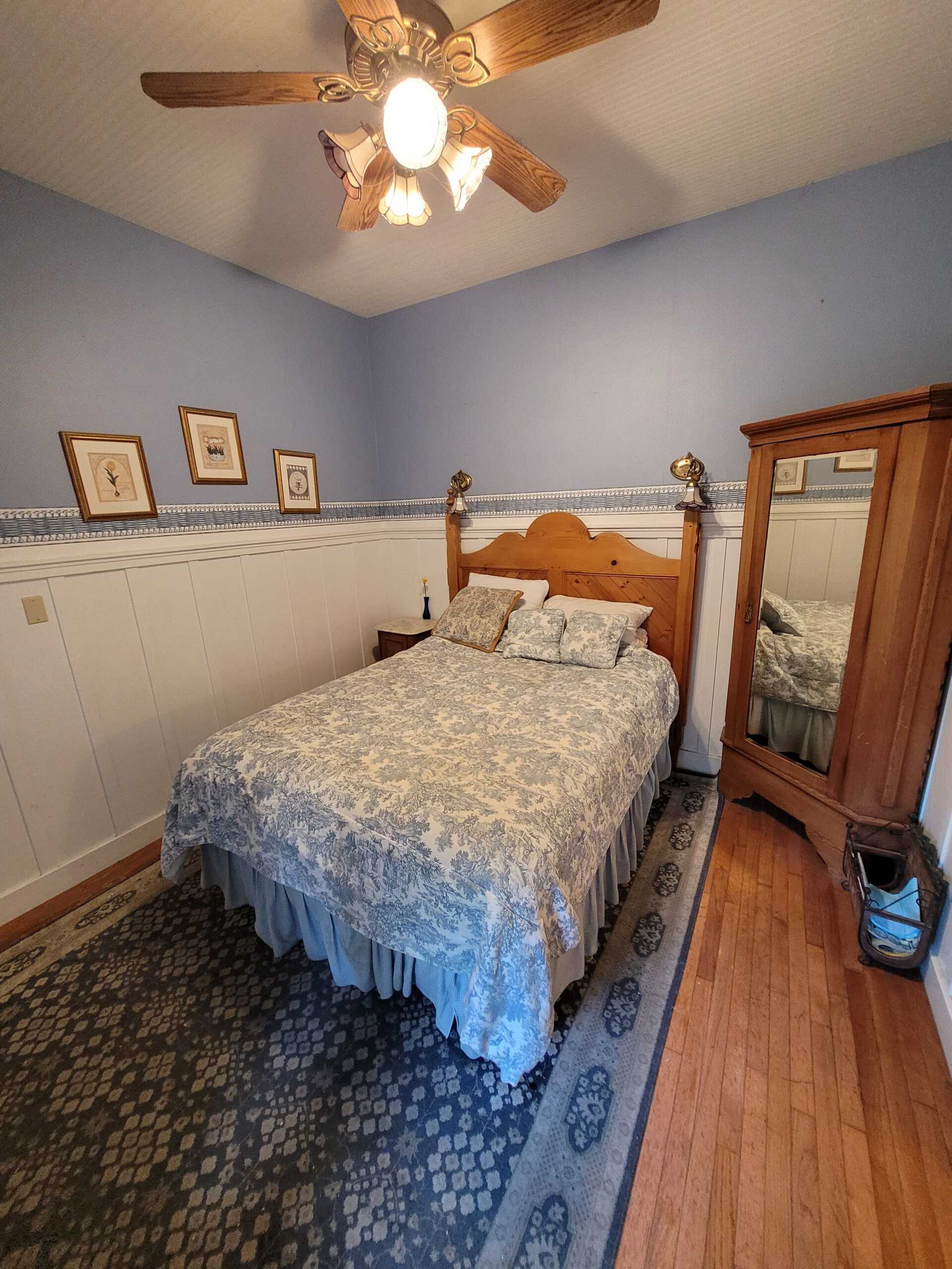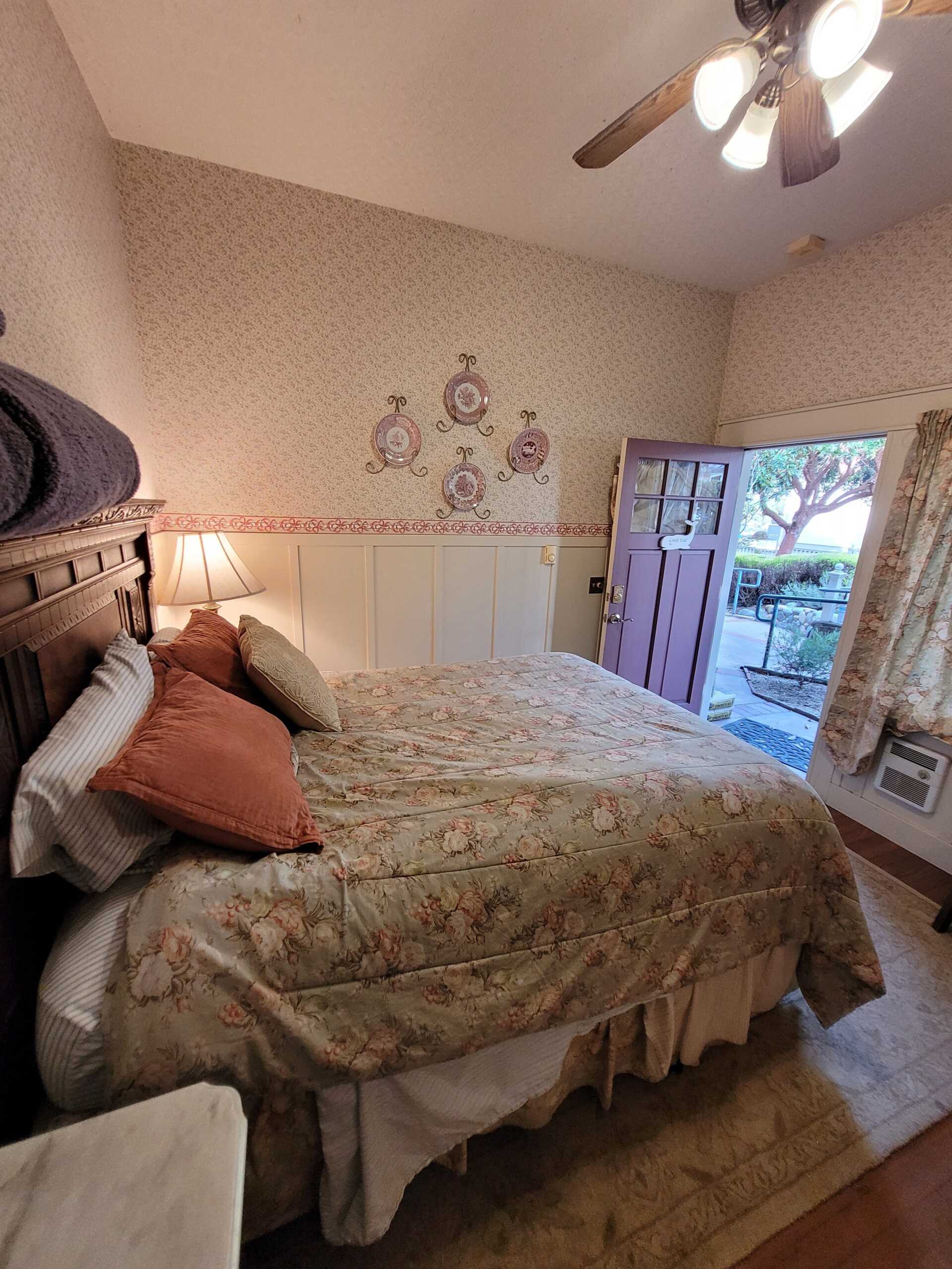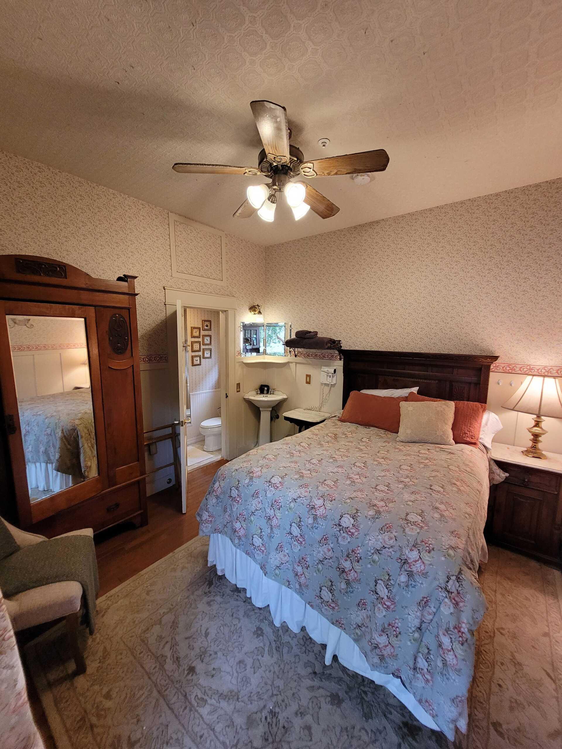 A bit of the East coast in Pacific Grove, this room is decorated in old fashioned rose and blue florals, has a cast iron stove, and a view of Central Ave. The turn of the century queen bed and antique furnishings will conjure fond memories of days gone by. The Cape Cod has a private bathroom with bathtub and showerhead.