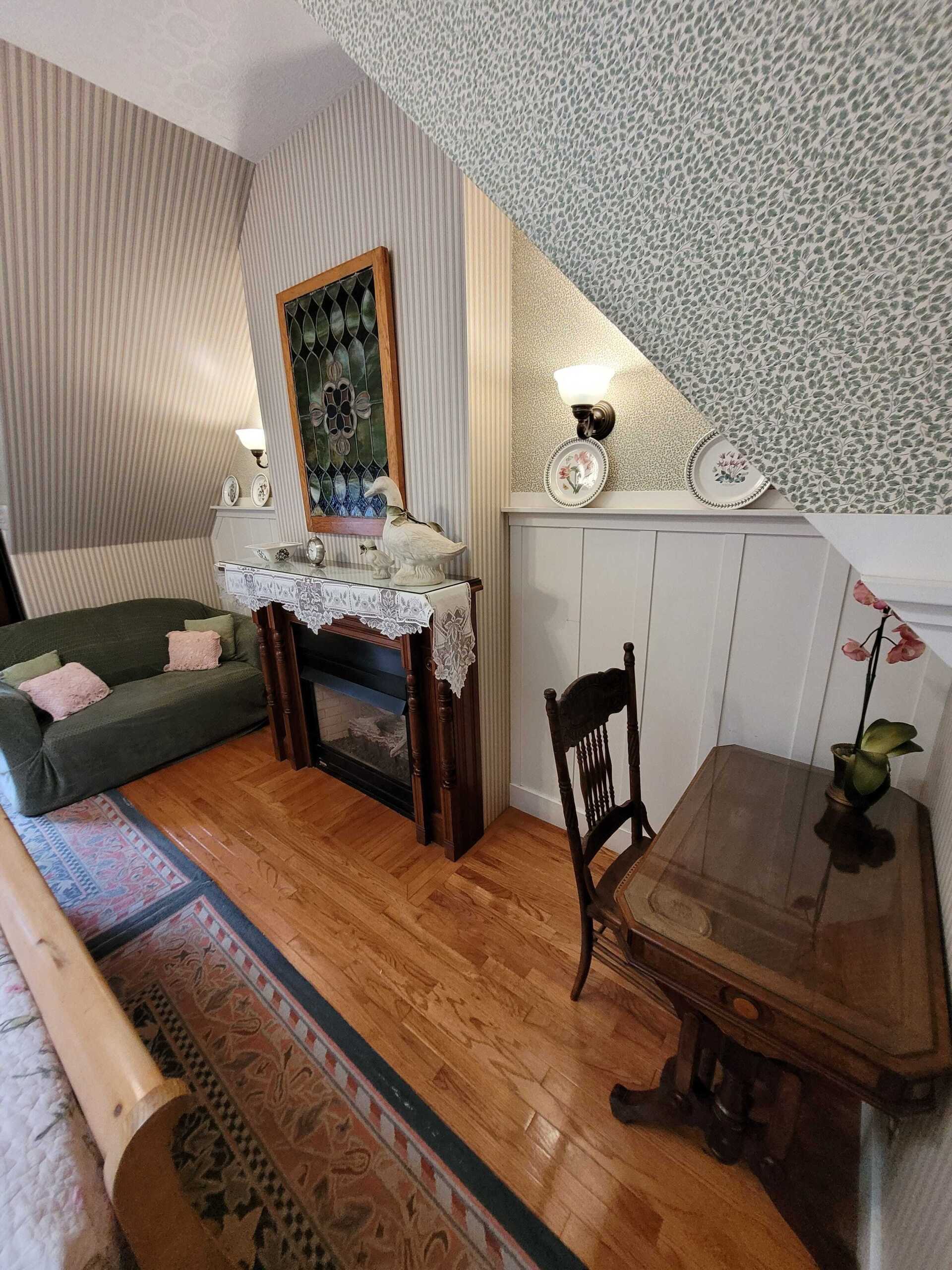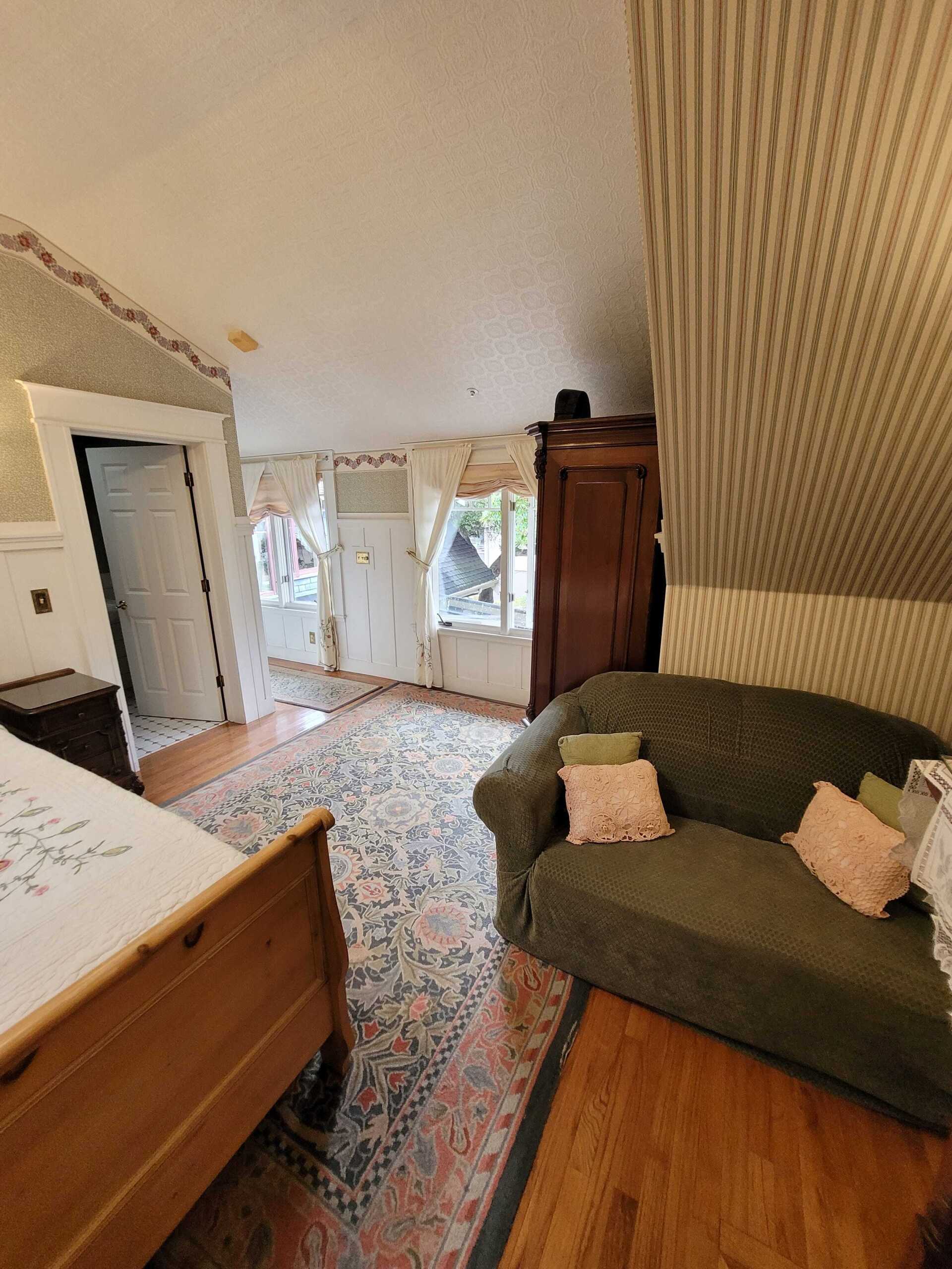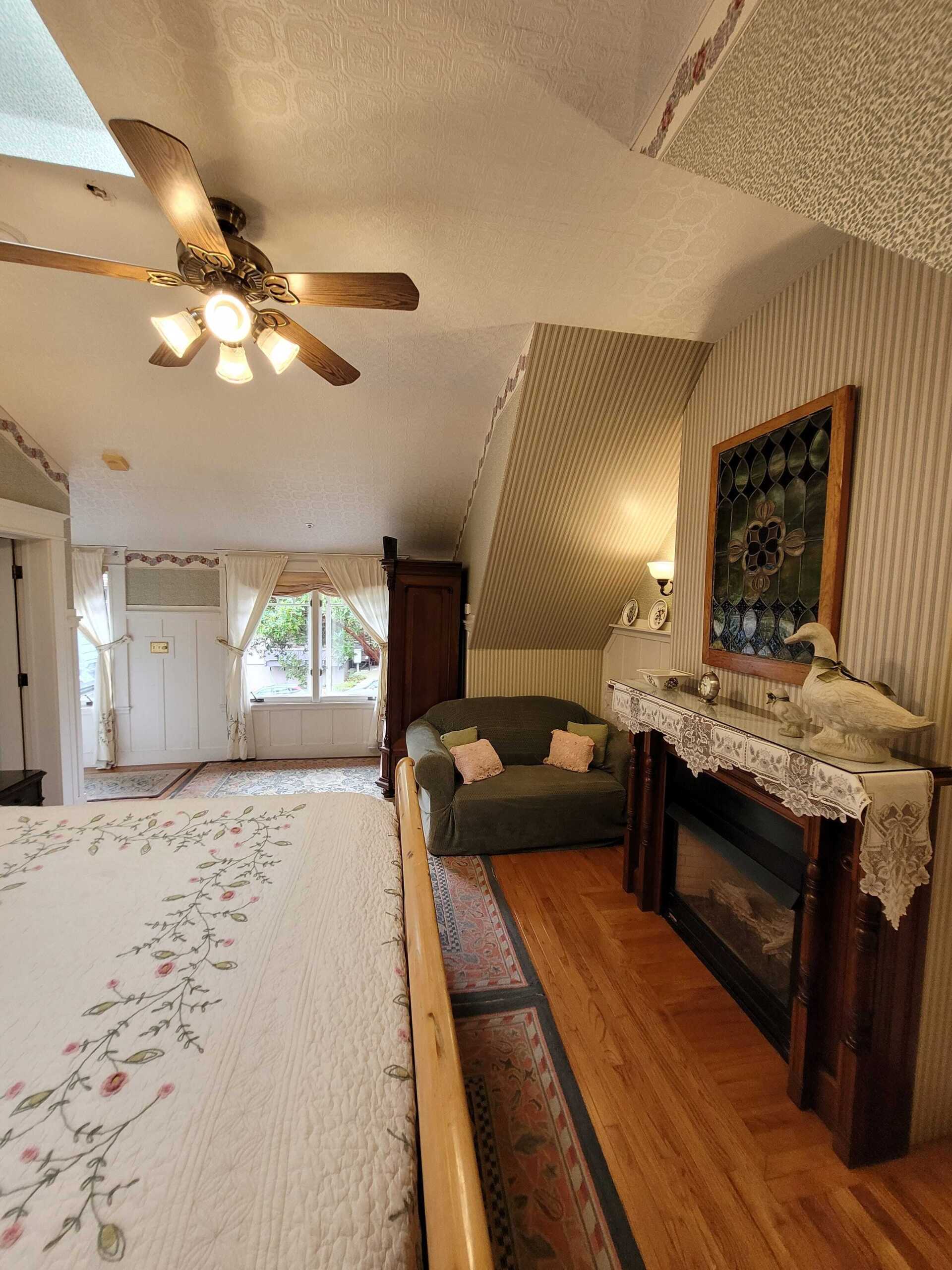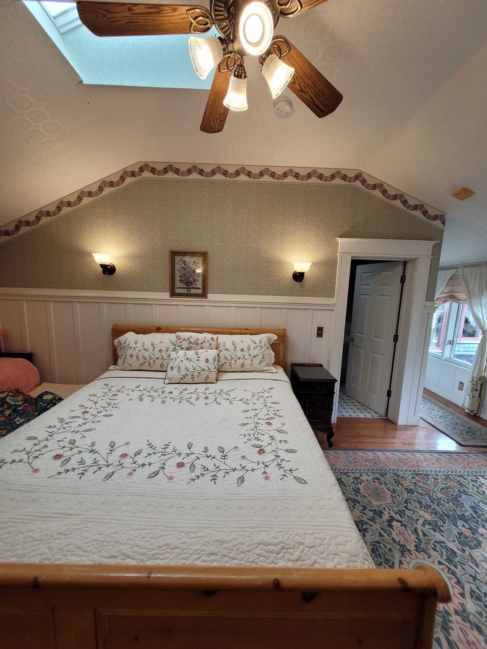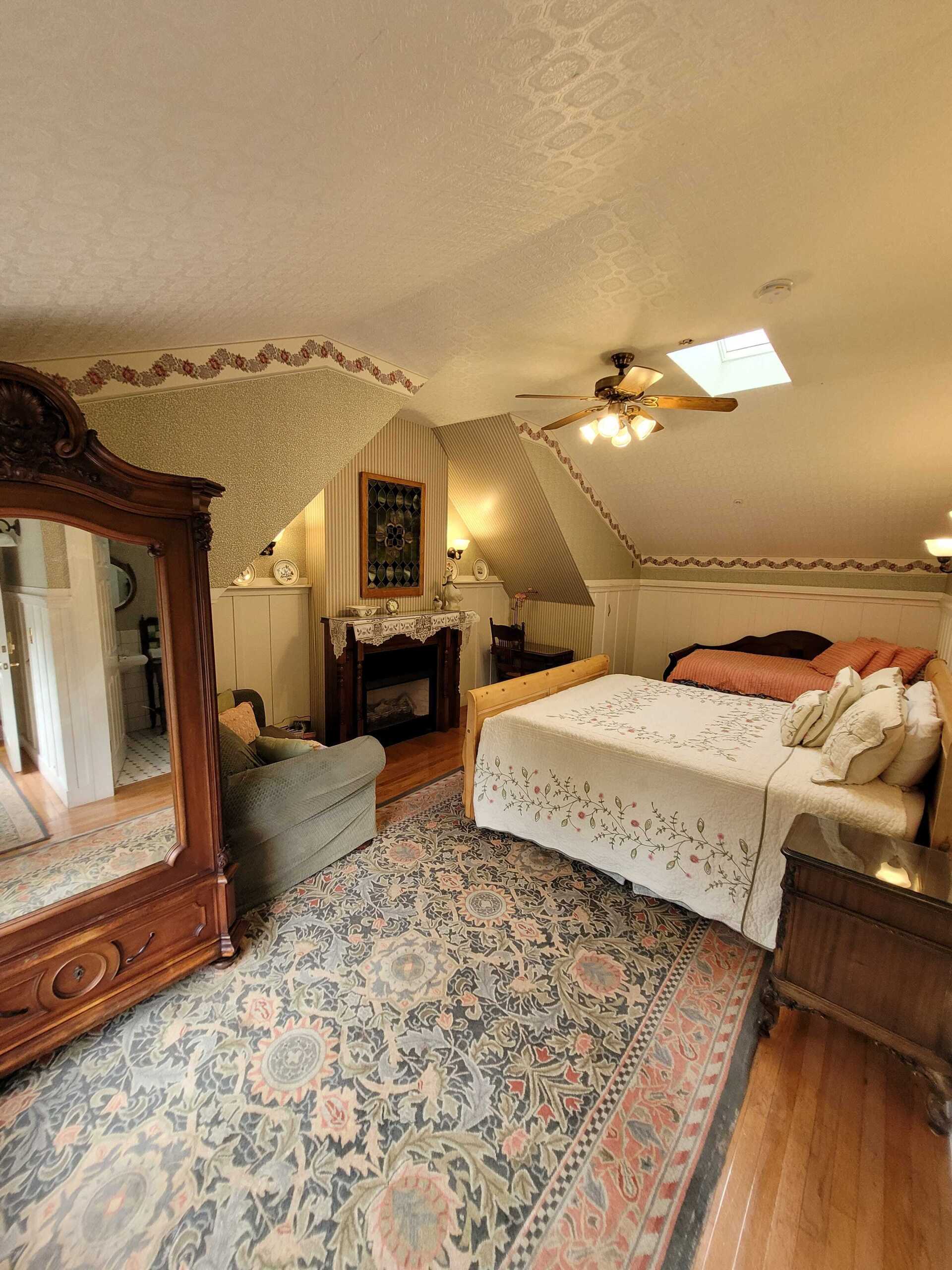Garden Gable is an extraordinarily large second floor room has a queen size bed. Other appointments include, a fireplace, sitting area, twin-sized trundle bed, ten foot ceilings, and a gable overlooking the garden. The Garden Gable has a private bathroom with bathtub and showerhead. This room can accommodate four people.