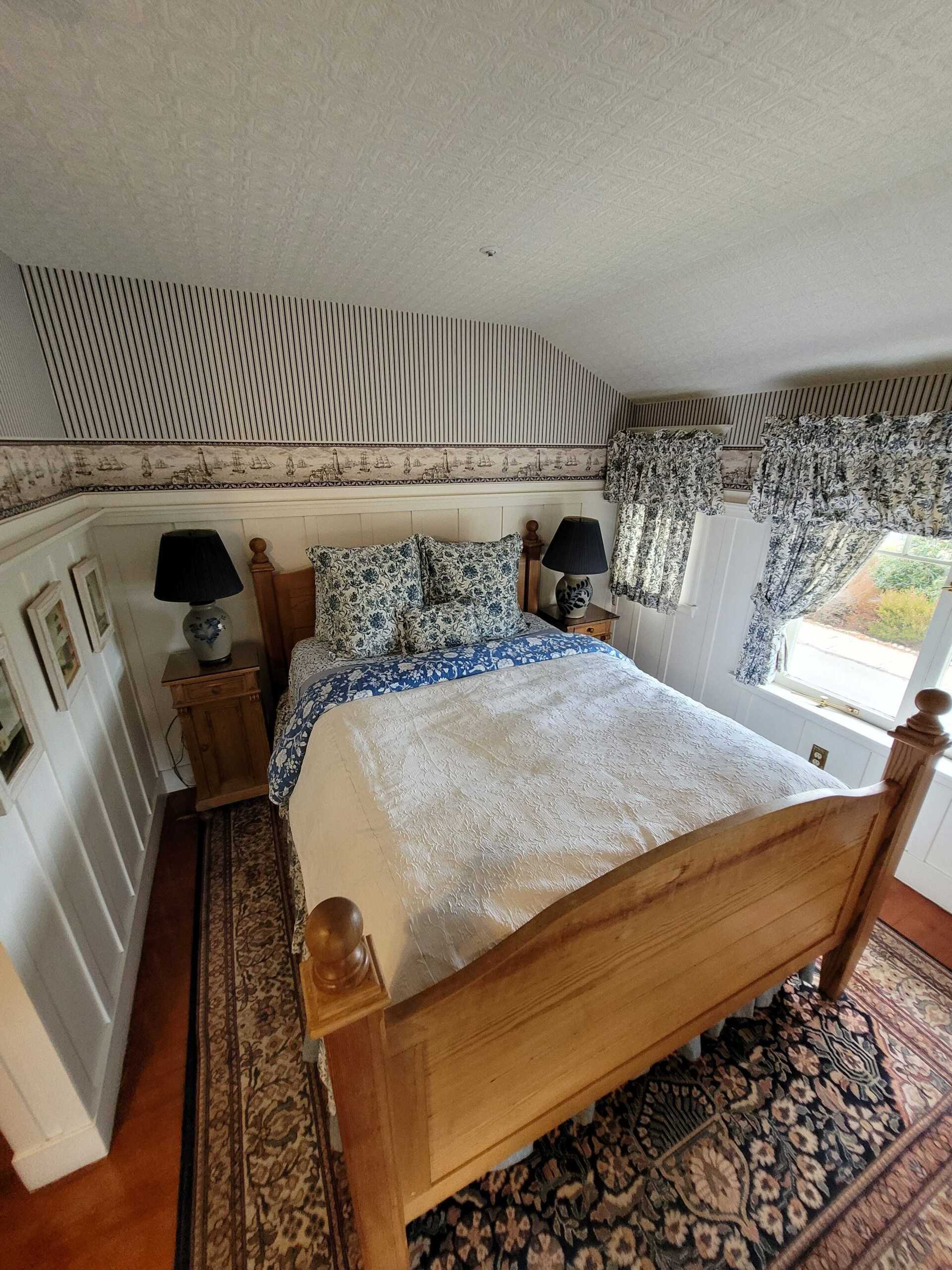 Blue and white décor impart a feeling of tranquility and restfulness in Whale Watch. Enjoy the partial ocean view from a private balcony of this second floor room. This room has a queen size bed and sitting area. A fireplace with antique mantel completes the feeling of repose. he Whale Watch has a private bathroom with bathtub and showerhead.