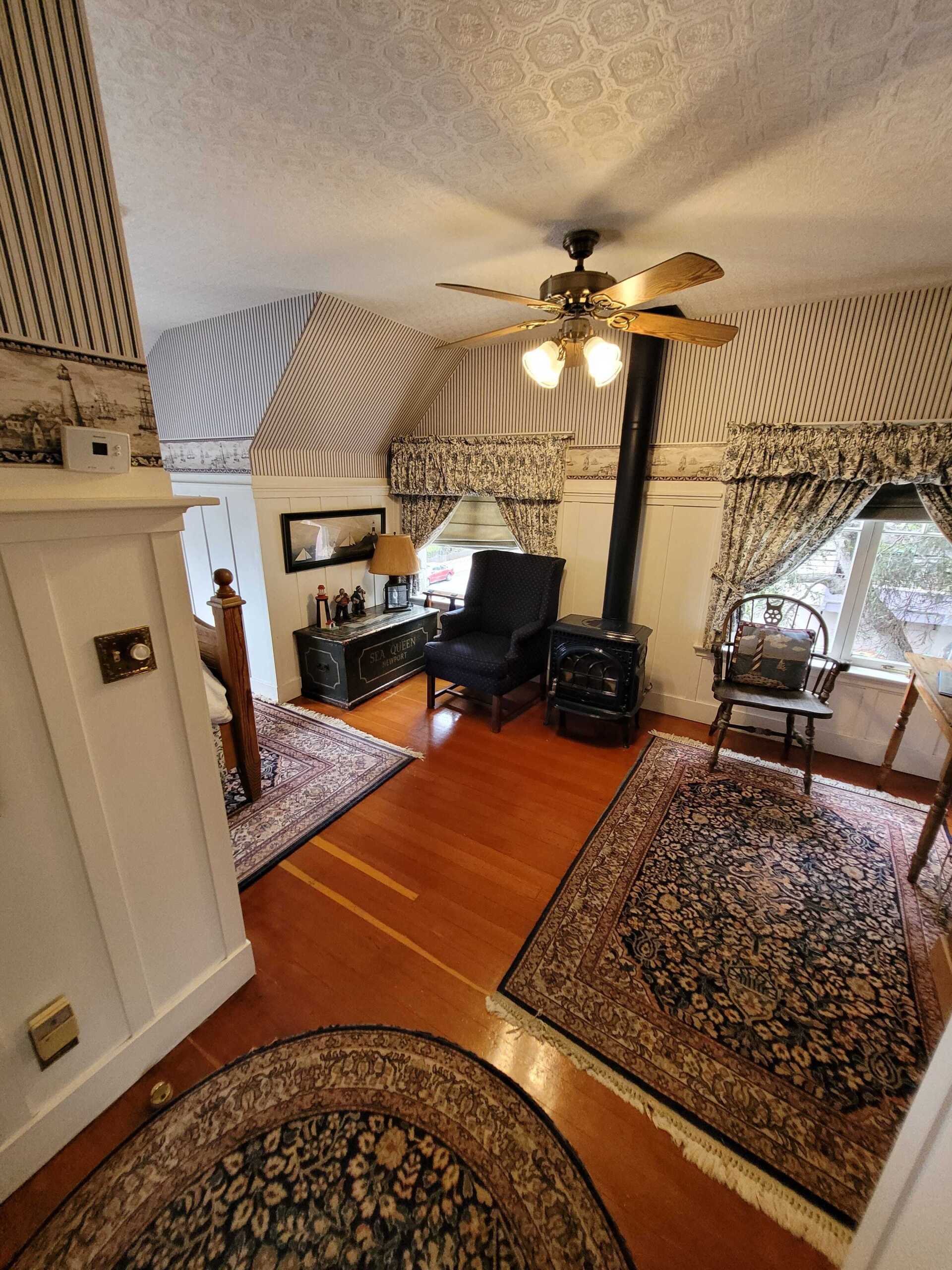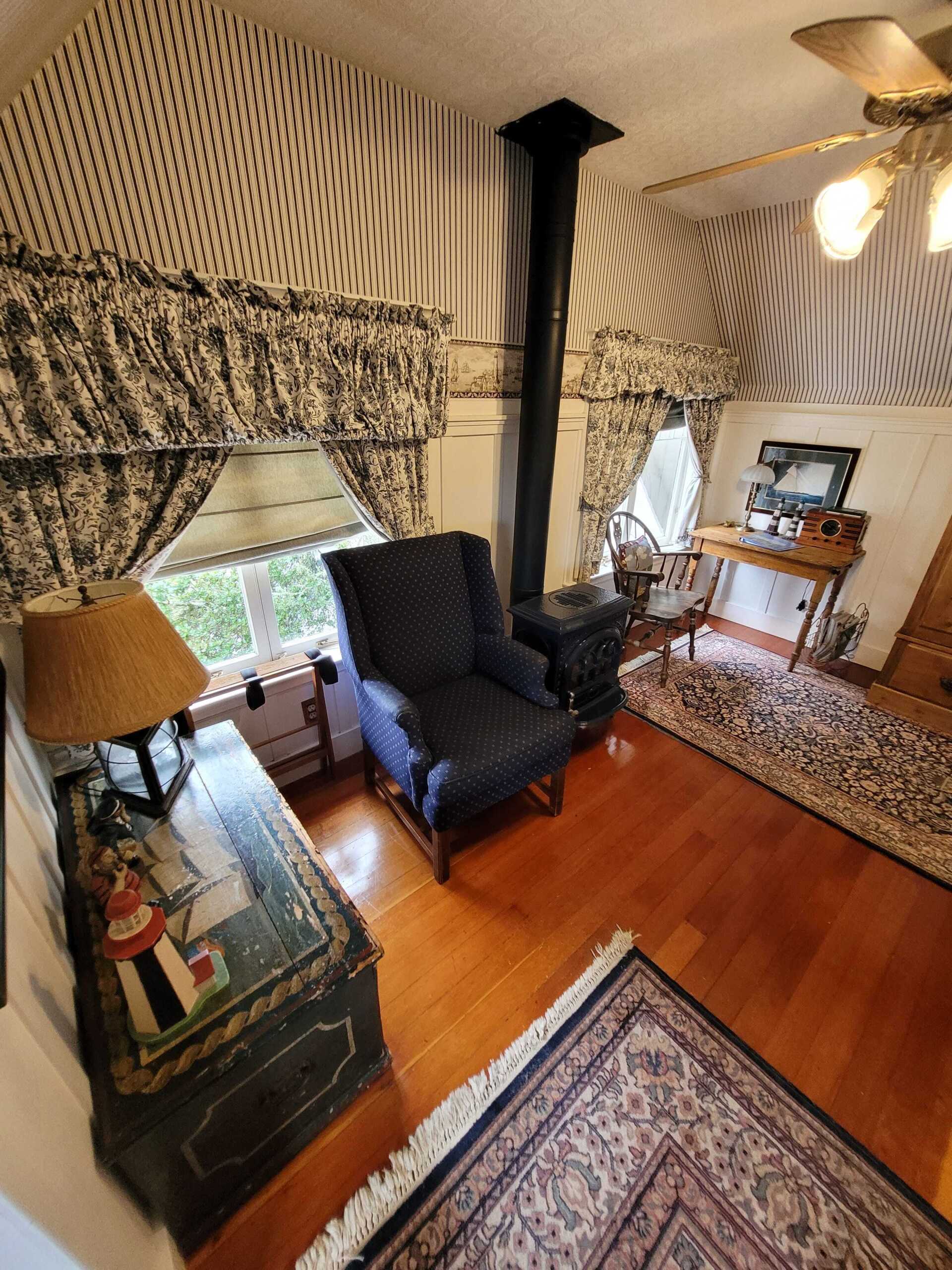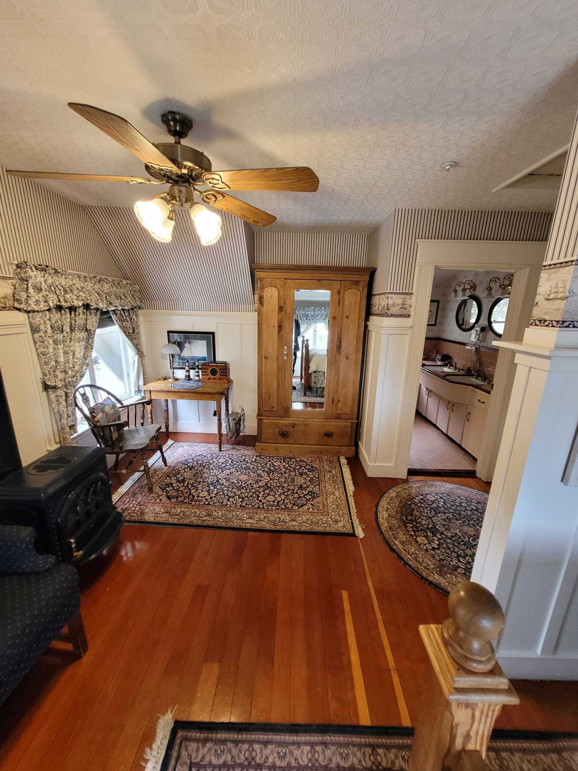 The Crow's Nest is a wonderful partial ocean view second floor room with nautical décor. Pine antiques, a queen bed, cast iron stove and sitting area add to your enjoyment. Shower (This is a large shower with a double sink).